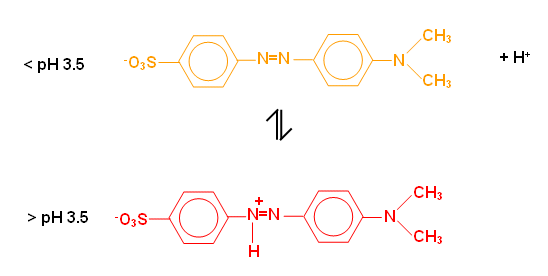 - Dye molecules, such as methyl orange, can have a different colour in acidic or alkaline conditions; compounds like this are often used as acid-base indicators: