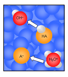 - If a strong base is added to the solution, then the incoming OH- ions will remove protons from the HA molecules to form H2O and A- ions. In this case, the HA has acted as a source of H+ ions; consequently the pH of the solution remains unchanged.