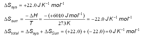 Stotal for the freezing of ice is negative and so the reverse occurs; the ice melts.