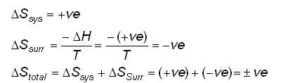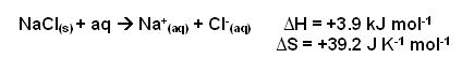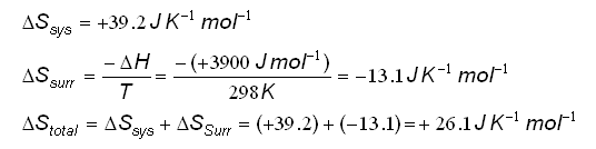 - At 298K, the entropy change is +26.1 J K-1 mol-1, so salt can dissolve to form a solution at 25oC.