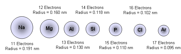 - As more protons are added, the nuclear pull on the electrons increases; as the electrons are being added to the same shell across each period, the atomic radii decreases as the extra charge pulls the electrons closer to the nucleus.