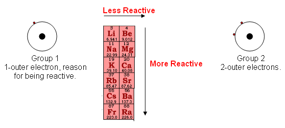 - The elements towards the bottom of the group are more reactive, because the one outer electron is further away from the positive nucleus, so the force needed to take the electron away is comparatively less than the elements toward the top of the group.