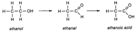 - Primary alcohols are oxidised to aldehydes and then carboxyl acids. For example, ethanol is oxidised to ethanal, which is then oxidised to ethanoic acid: